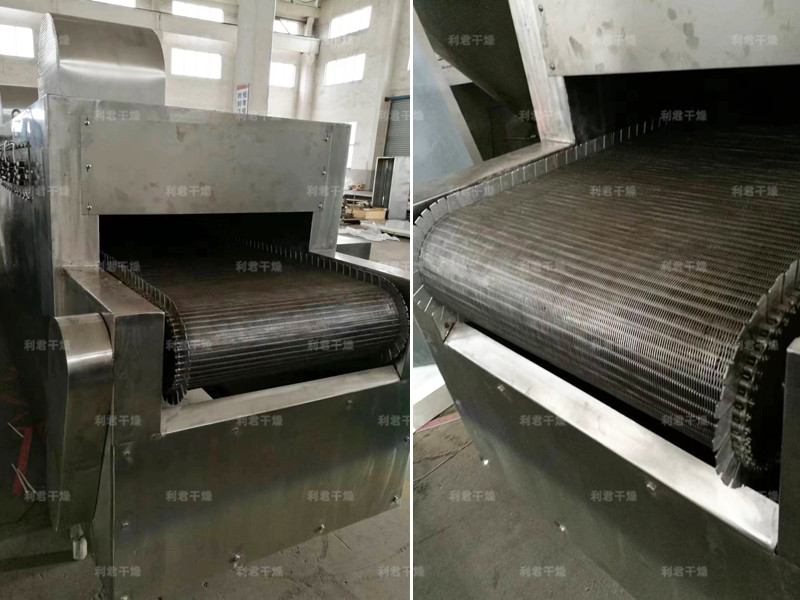 物料由加料器均勻地鋪在網帶上,網帶一般采用12-60目不銹鋼絲網,由傳動裝置拖動在干燥機內移動。干燥機由若干單元組成,每一單元熱風獨立循環,部分尾氣由專門排濕風機排出,廢氣由調節閥控制,熱氣由下往上或由上往下穿過鋪滿物料的網帶完成熱量與質量傳遞的進程,帶走物料水份。網帶緩慢移動,運行速度可根據物料溫度自由調節,干燥后的成品連續落入收料器中。上下循環單元根據用戶需要可靈活配備,單元數量亦可根據需要選取。