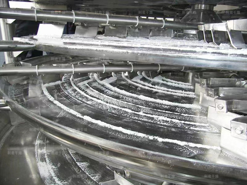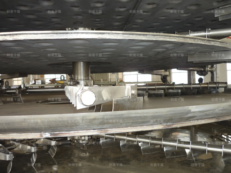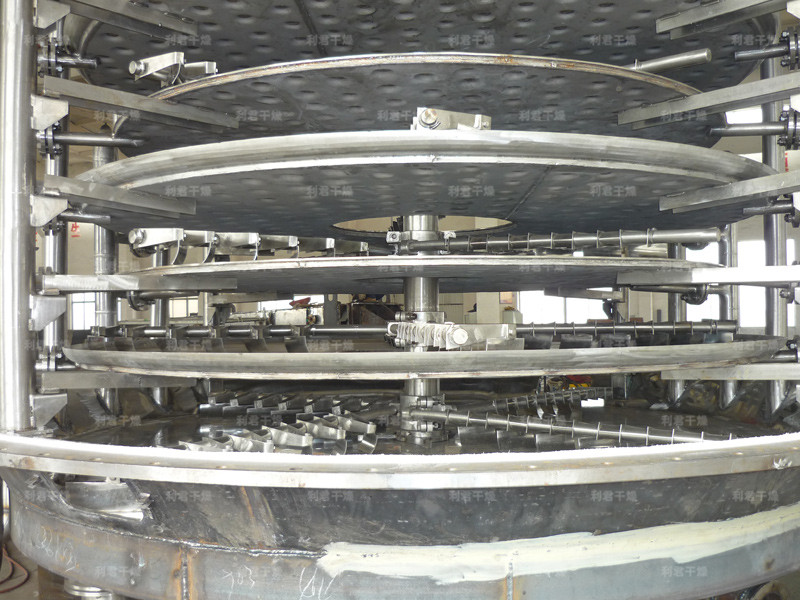 濕物料自加料器連續地加到干燥器上部第一層干燥盤上,帶有耙葉的耙臂作回轉運動使耙臂作回轉運動使耙葉連續地翻抄物料。物料沿指數螺旋線流過干燥盤表面,在小干燥盤上的物料被移送到外緣,并在外緣落到下方的大干燥盤外緣,在大干盤上物料向里移動并從中間落料口落如下一層小干燥盤中。大小干燥盤上下交替排列,物料得以連續地流過整個干燥器。中空的干燥盤內通入加熱介質,加熱介質形式有飽和蒸汽、熱水和導熱油,加熱介質由干燥盤的一端進入,從另一端導出。已干物料從最后一層干燥盤落到殼體的底層,最后被耙葉移送到出料口排出。濕份從物料中逸出,由設在頂蓋上的排濕口排出,真空型盤式干燥器的濕氣由設在頂蓋上的真空泵口排出。從底層排出的干物料可直接包裝。通過配加翅片加熱器、溶劑回收冷凝器、袋式除塵器、干料返混機構、引風機等輔機,可提高其干燥的生產能力,干燥膏糊狀和熱敏性物 料,可方便地回收溶劑,并能進行熱解和反應操作。