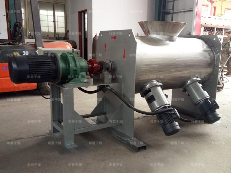 該機型由傳動機構、臥式筒體、犁刀、飛刀四部分組成,物料在犁刀作用下沿筒壁作軸向流支,當物料流經飛刀時被高速度旋轉的飛刀拋灑,從而在較短時間內達到均勻混合。