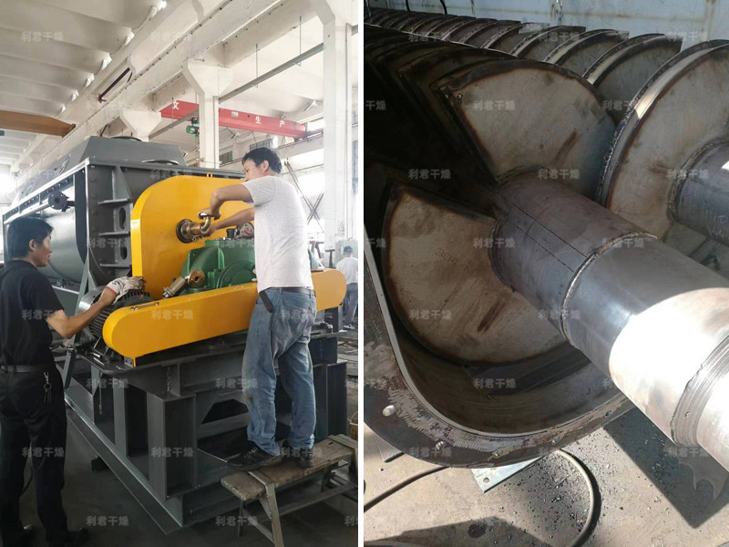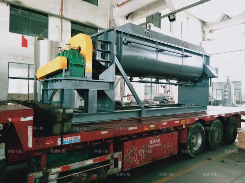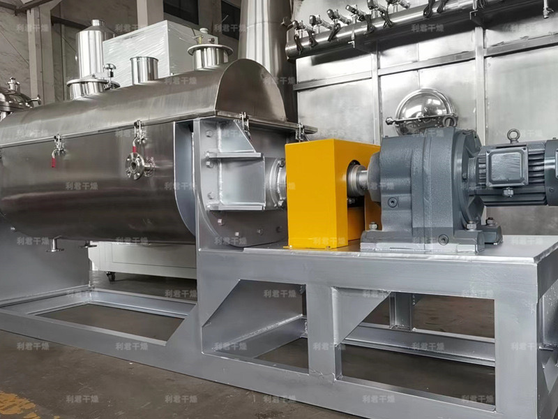 空心軸上密集排列著楔型中空漿葉,熱介質(zhì)經(jīng)空心軸流經(jīng)漿葉。單位有效容積內(nèi)傳熱面積很大,熱介質(zhì)溫度從-40℃到320℃,可以是水蒸汽,也可以是液體型:如熱水、導(dǎo)熱油等。間接傳導(dǎo)加熱,沒有攜帶空氣帶走熱量,熱量均用來加熱物料。熱量損失僅為通過器體保溫層向環(huán)境的散熱。楔型漿葉傳熱面具有自清潔功能。物料顆粒與楔型面的相對運(yùn)動產(chǎn)生洗刷作用,能夠洗刷掉楔型面上附著物料,使運(yùn)轉(zhuǎn)中一直保持著清潔的傳熱面。漿葉干燥機(jī)的殼體為Ω型,殼體內(nèi)一般安排二到四根空心攪拌軸。殼體有密封端蓋與上蓋,防止物料粉塵外泄而充分發(fā)揮作用。