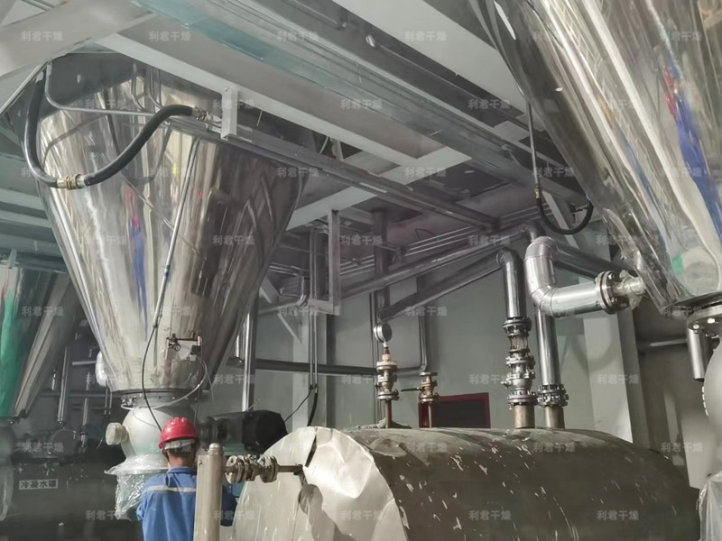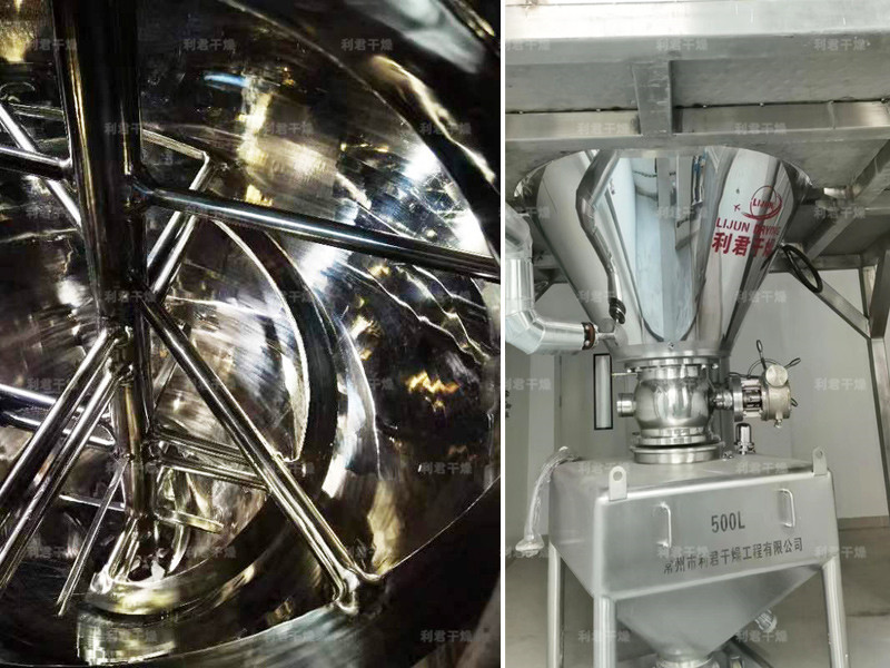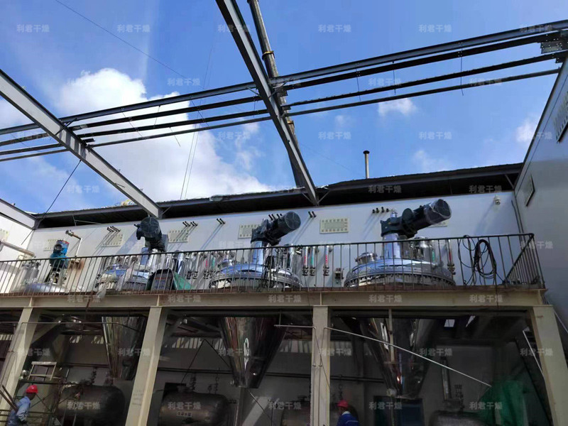 ●干燥階段:濾餅脫水后,通過回轉使濾餅疏松,同時,夾套內蒸汽對內壁進行加熱,通過熱傳導對濾餅進行加熱升溫,濕份迅速蒸發達到干燥的效果。通過設備內抽真空的方法加快蒸發速度。通過加入處理后的熱氮氣等介質帶走蒸發的濕份,可加速物料的干燥,提高干燥效果。